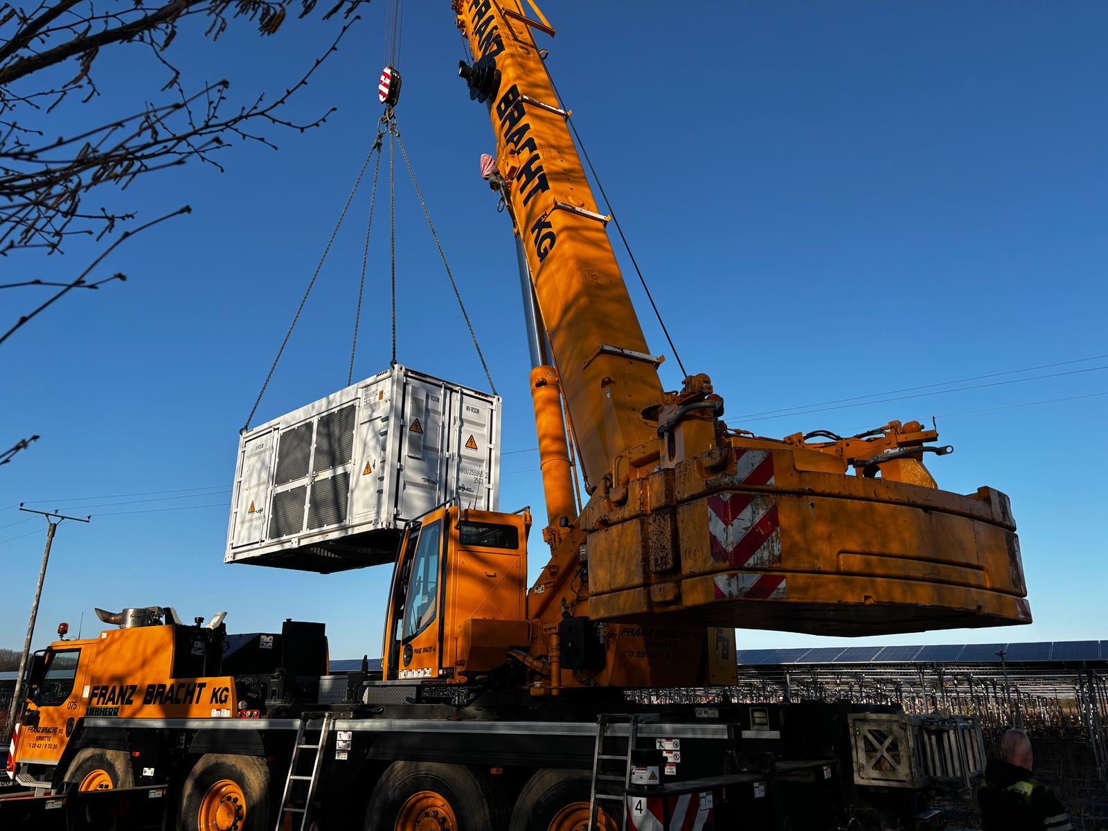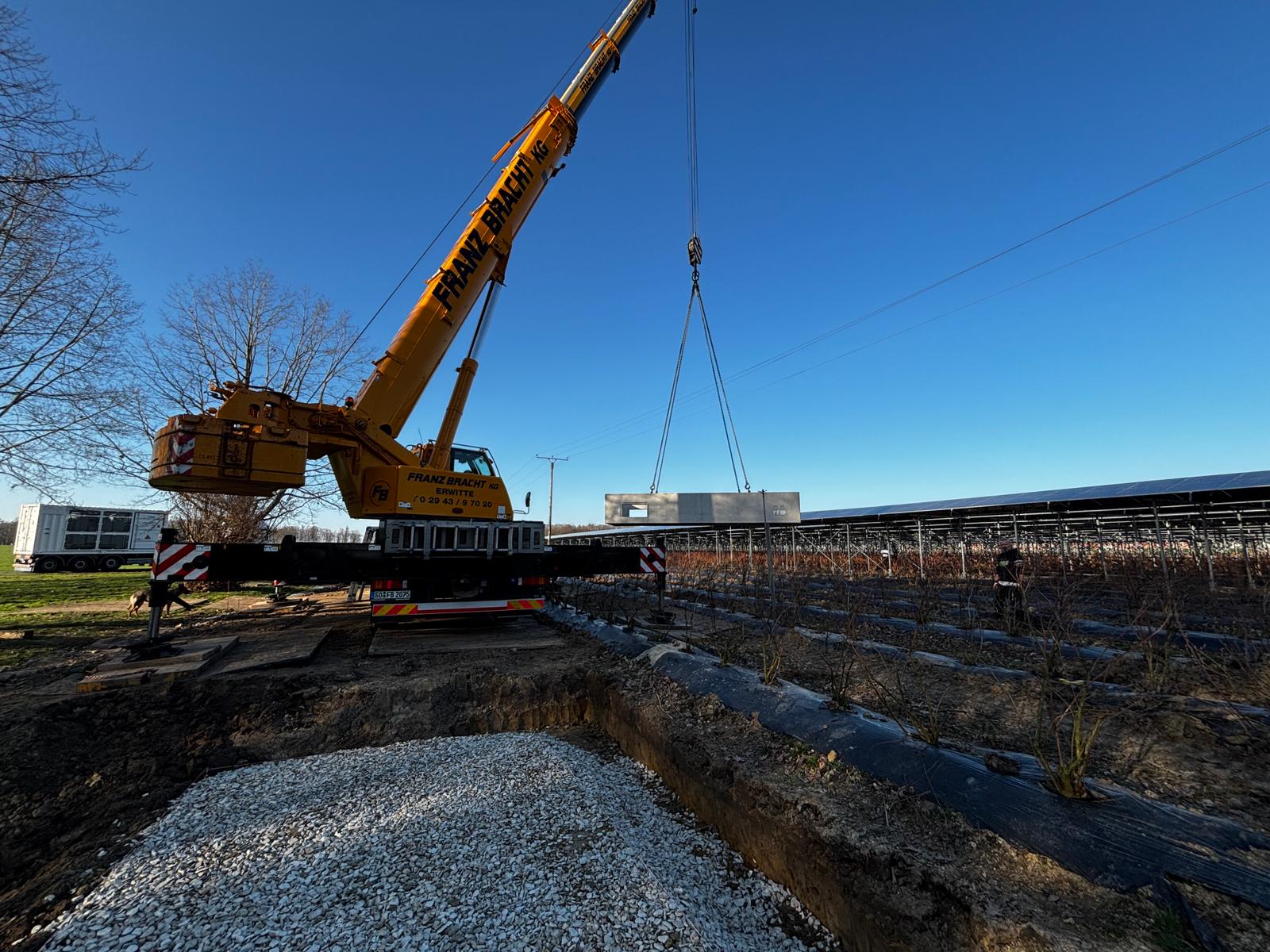 Die Trafostationen wurden erfolgreich auf die Baustelle geliefert und per Kran an ihren vorgesehenen Platz gehoben. Sie sind ein zentraler Bestandteil der Anlage und sorgen später dafür, dass der erzeugte Solarstrom ins Netz eingespeist werden kann.