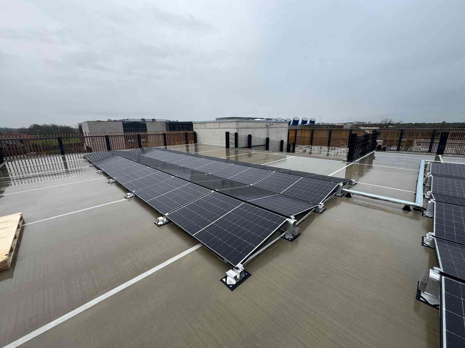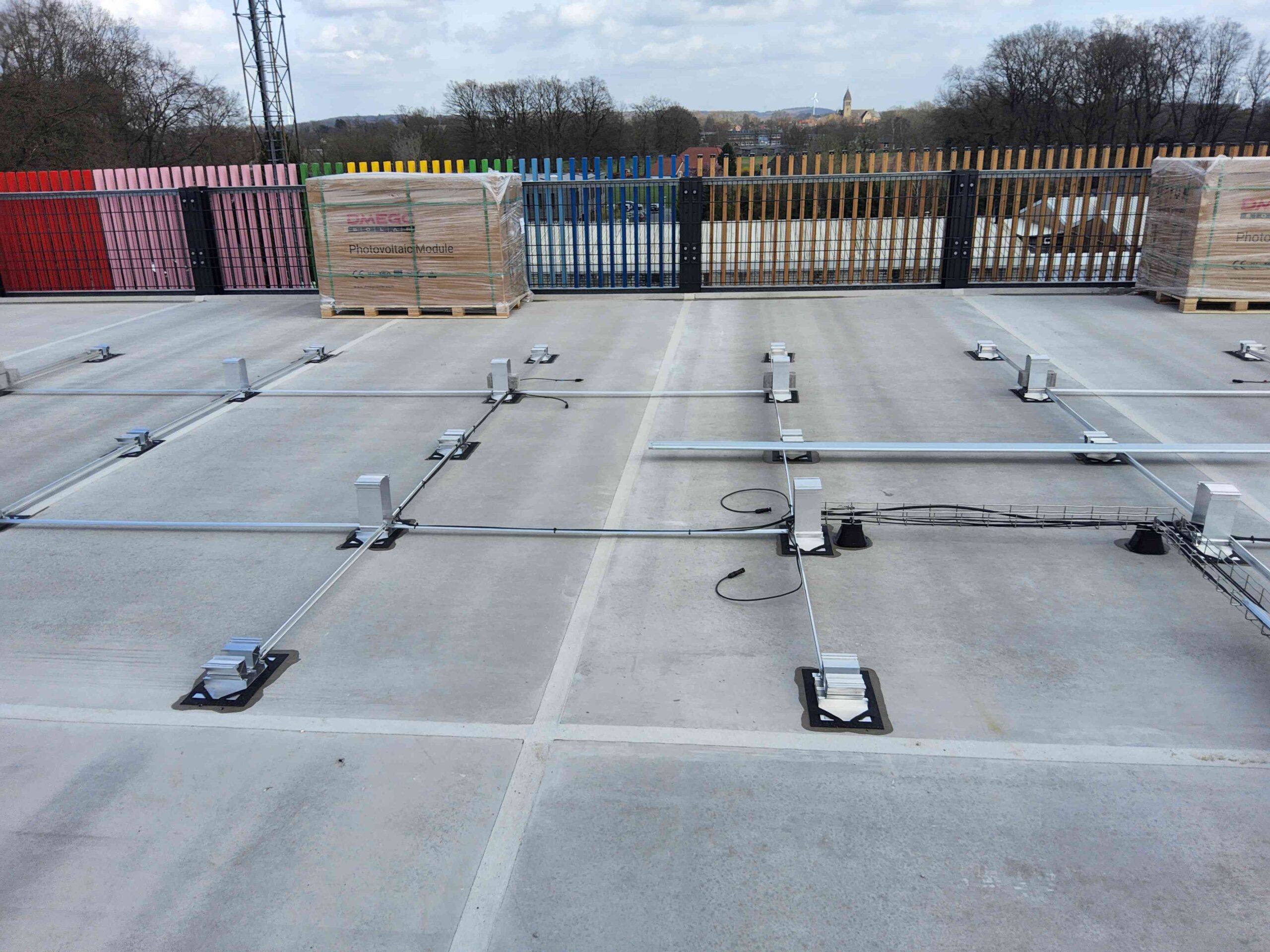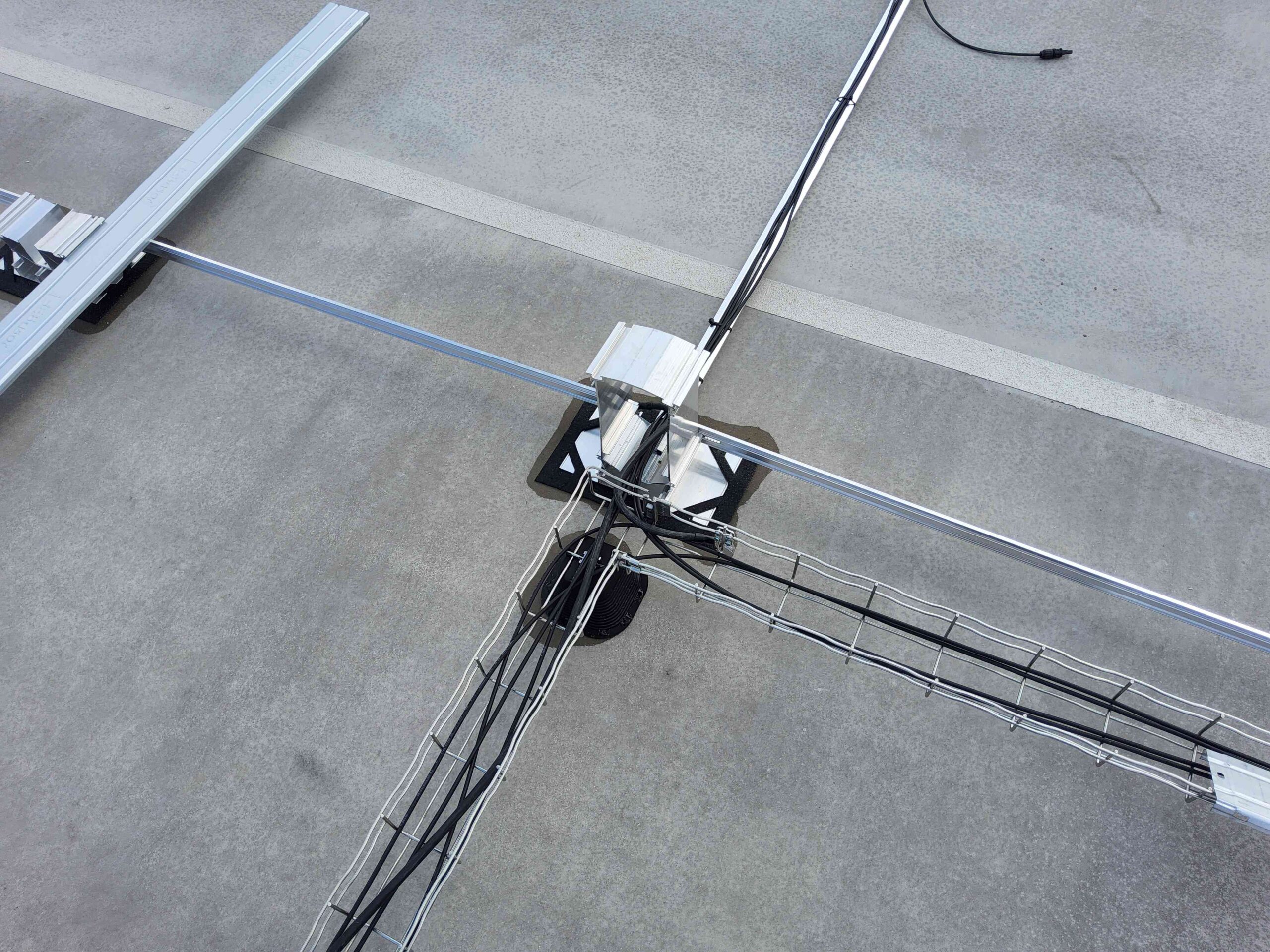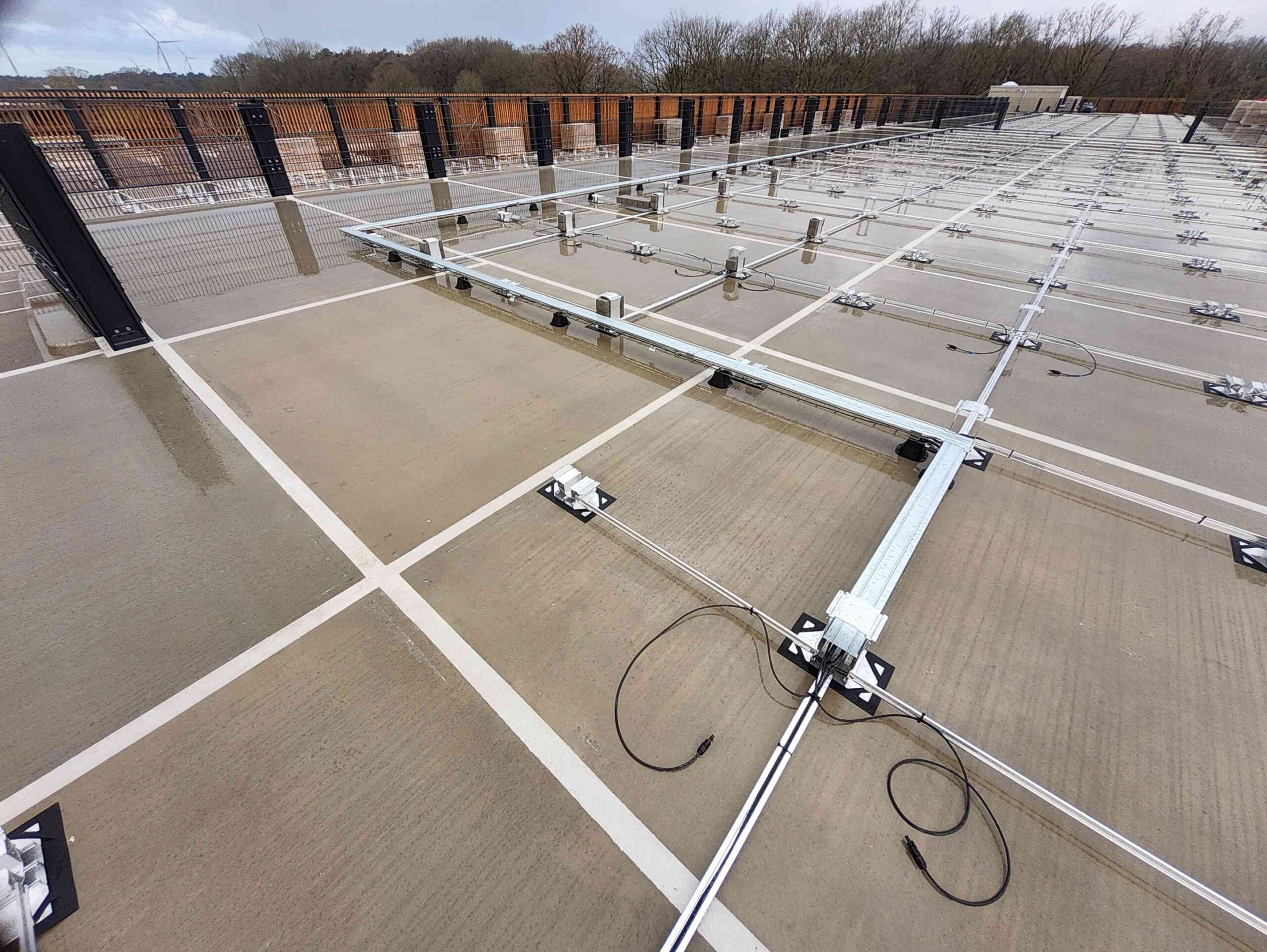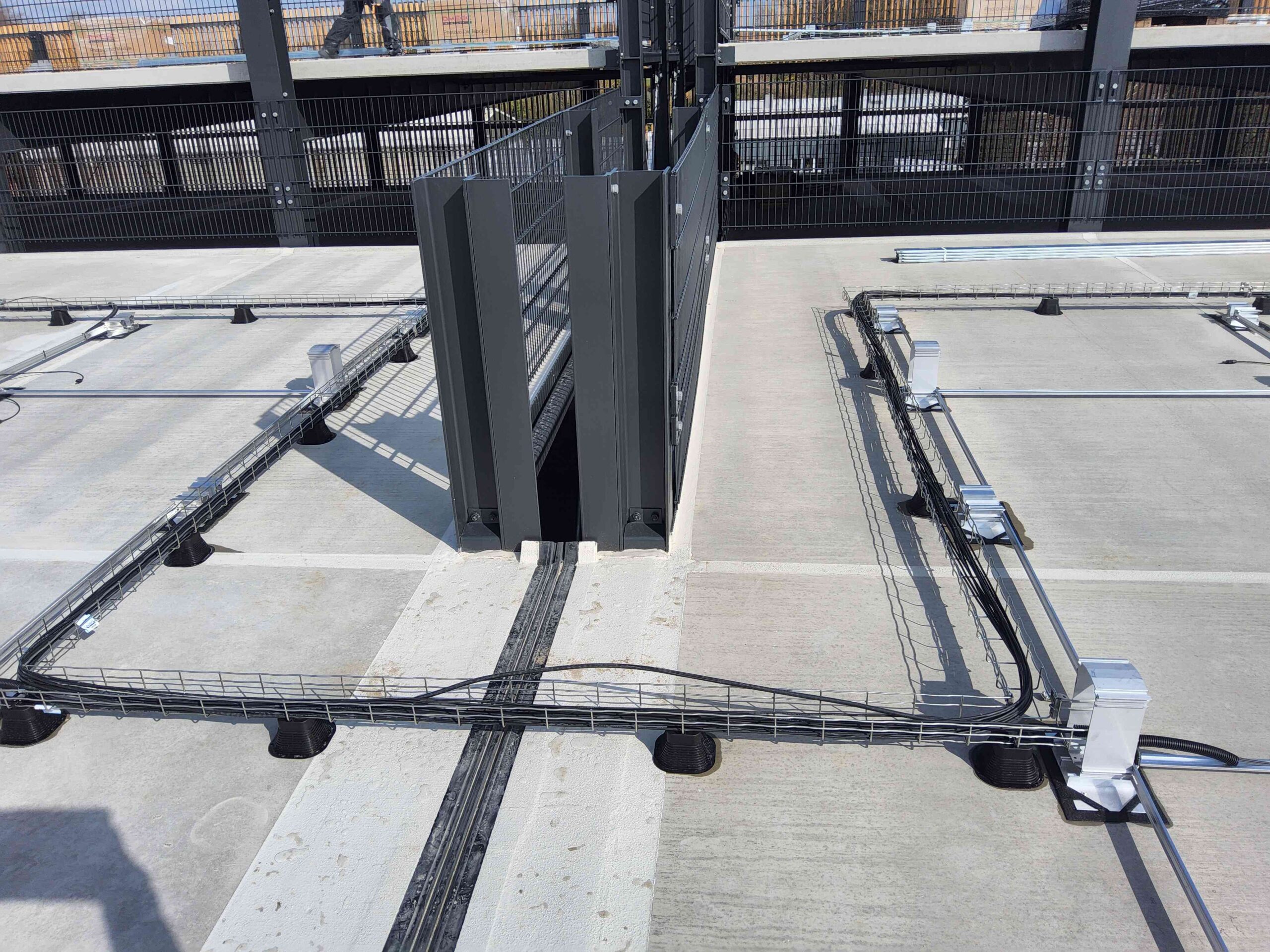 Auch die gesamte Ballastierung der Unterkonstruktion, die DC-Kabelwege vom Hersteller Conduct sowie die DC-Stringleitungen wurden auf das Parkdeck transportiert.