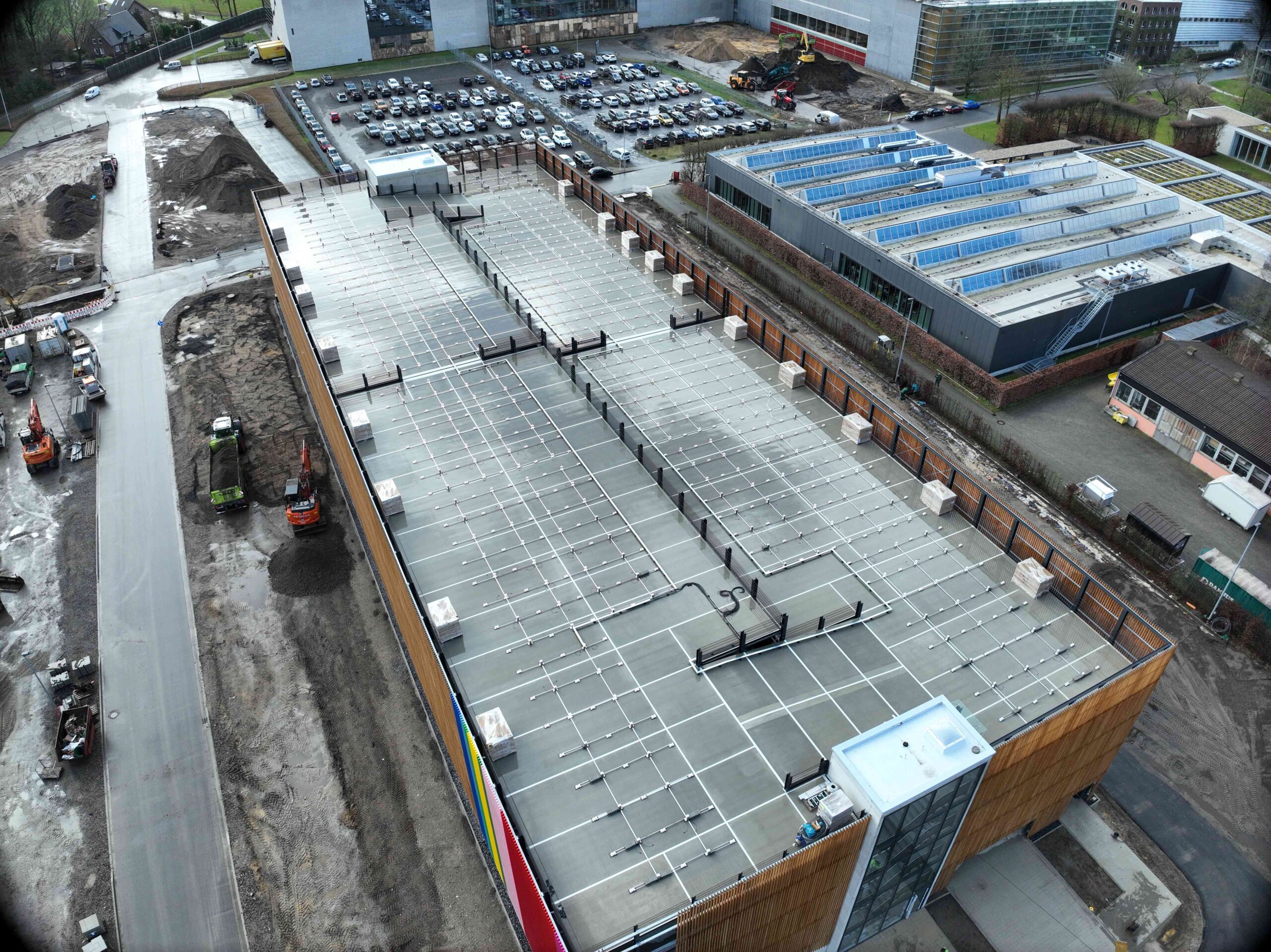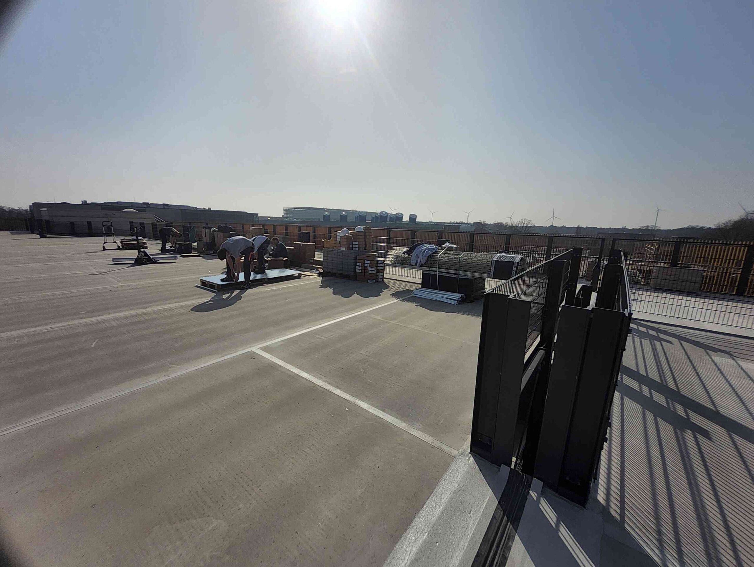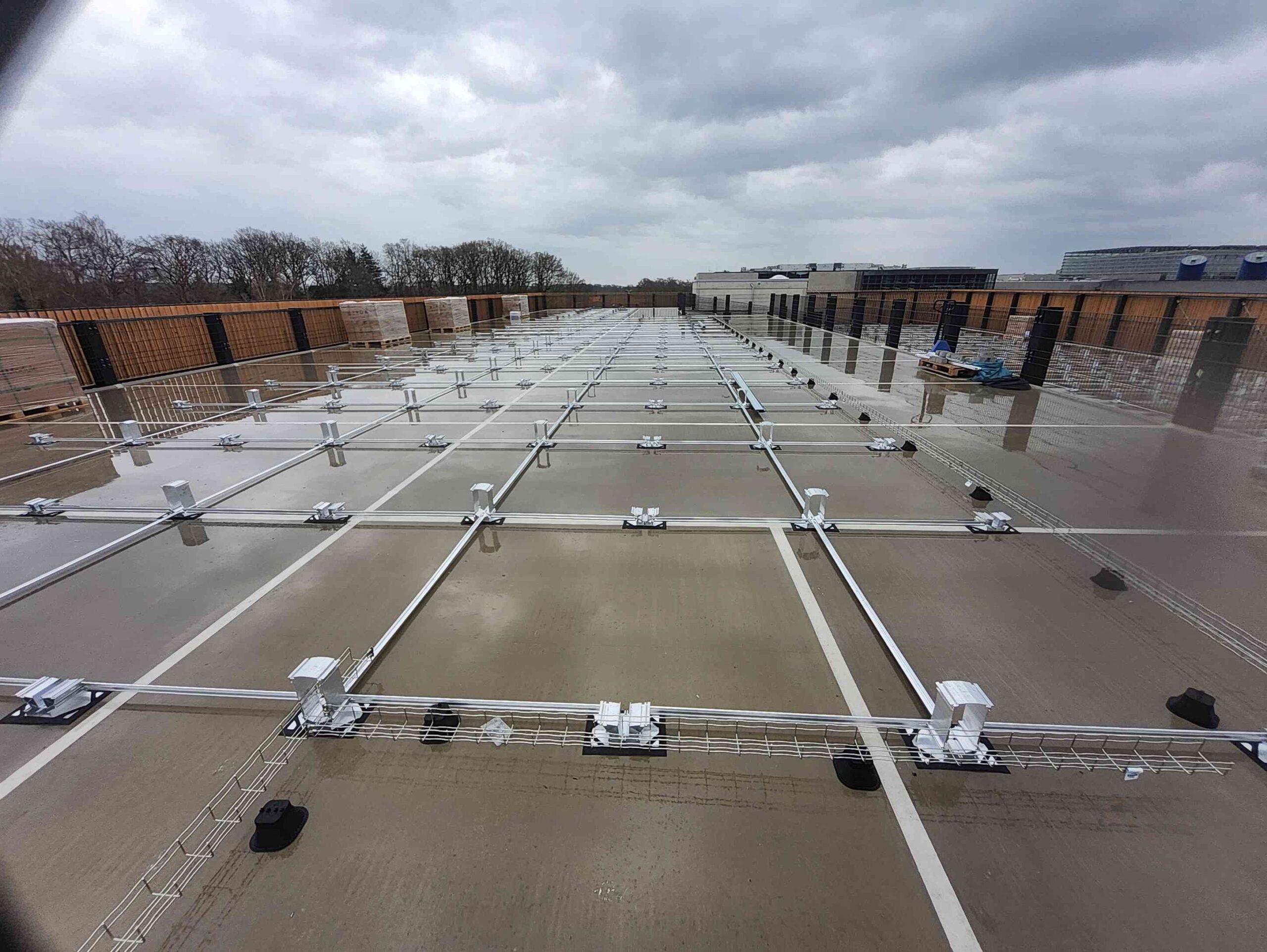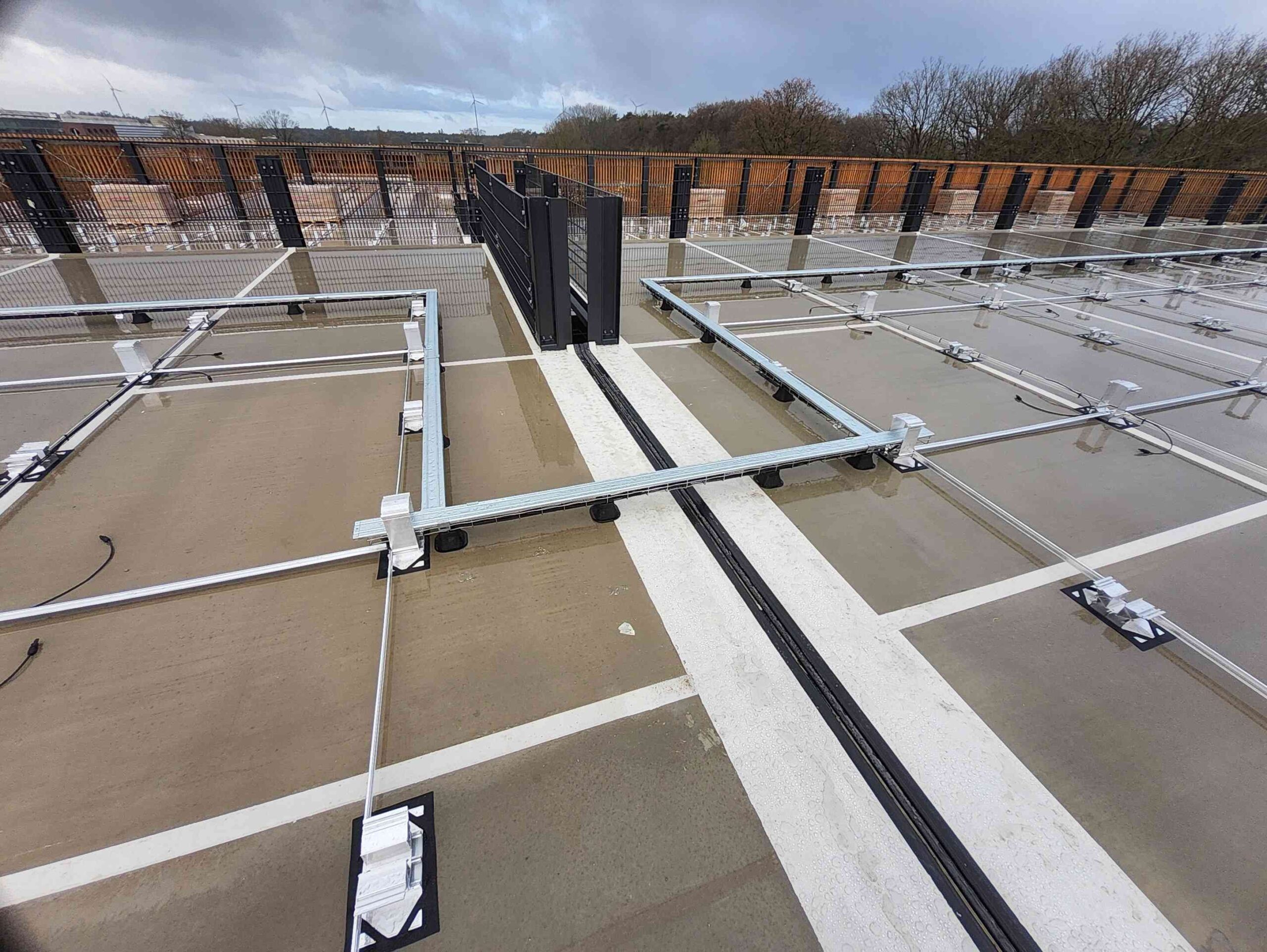 Auch die gesamte Ballastierung der Unterkonstruktion, die DC-Kabelwege vom Hersteller Conduct sowie die DC-Stringleitungen wurden auf das Parkdeck transportiert.