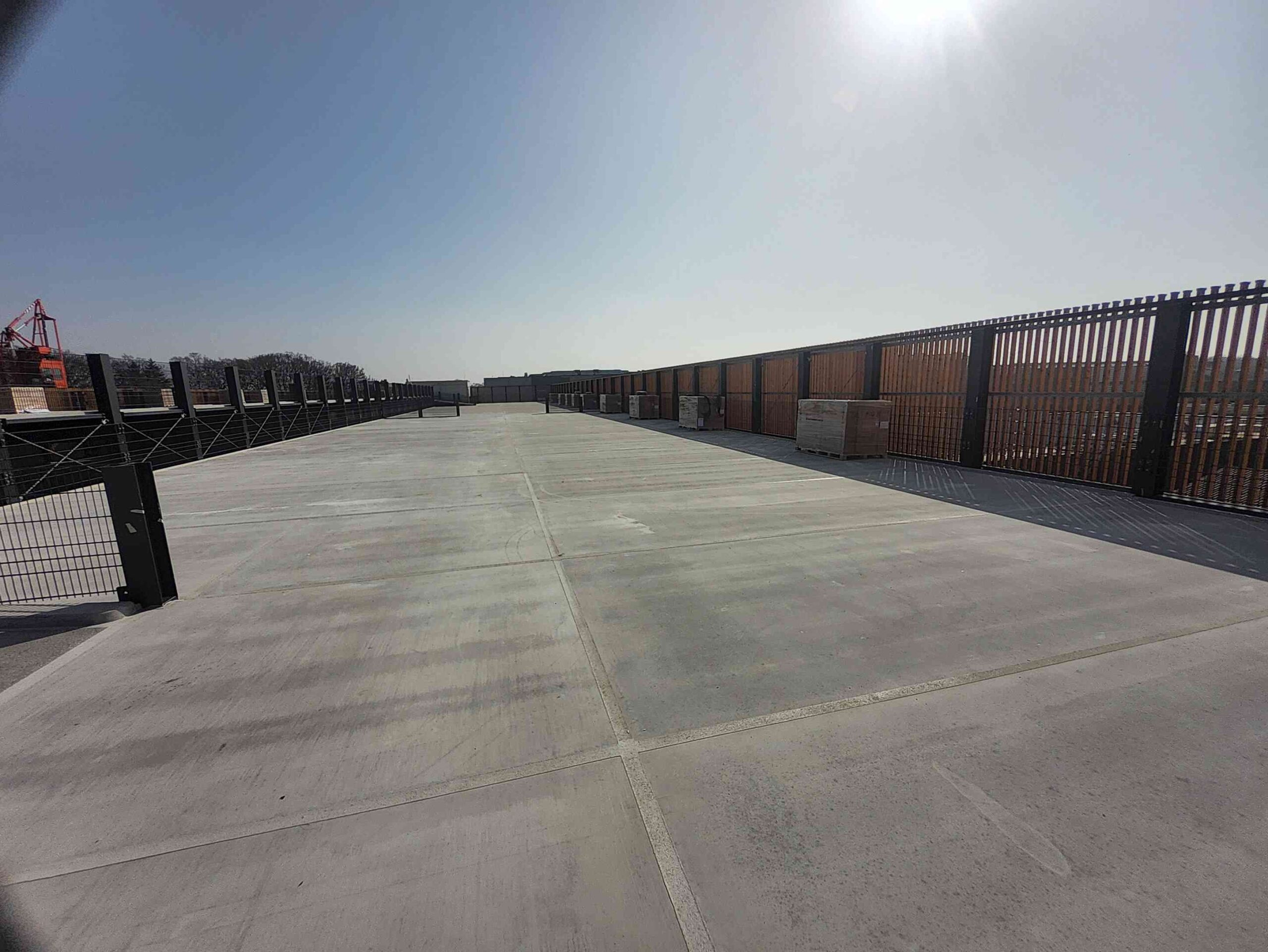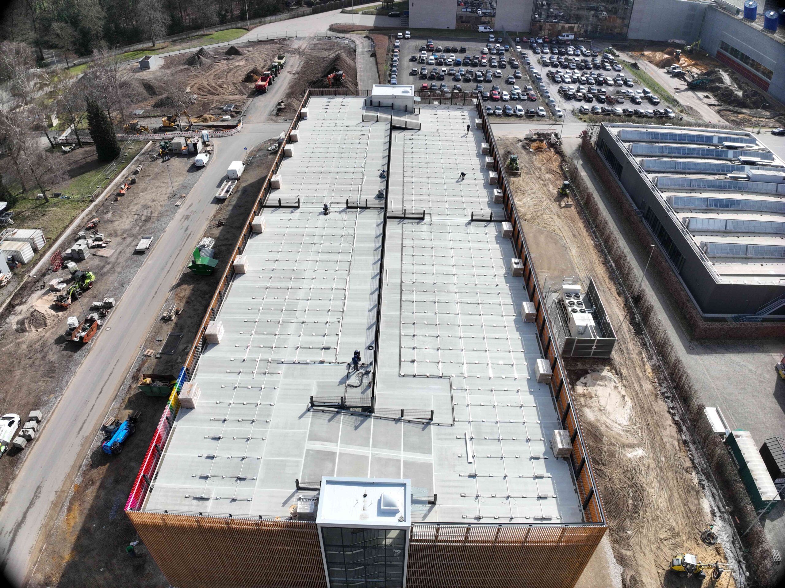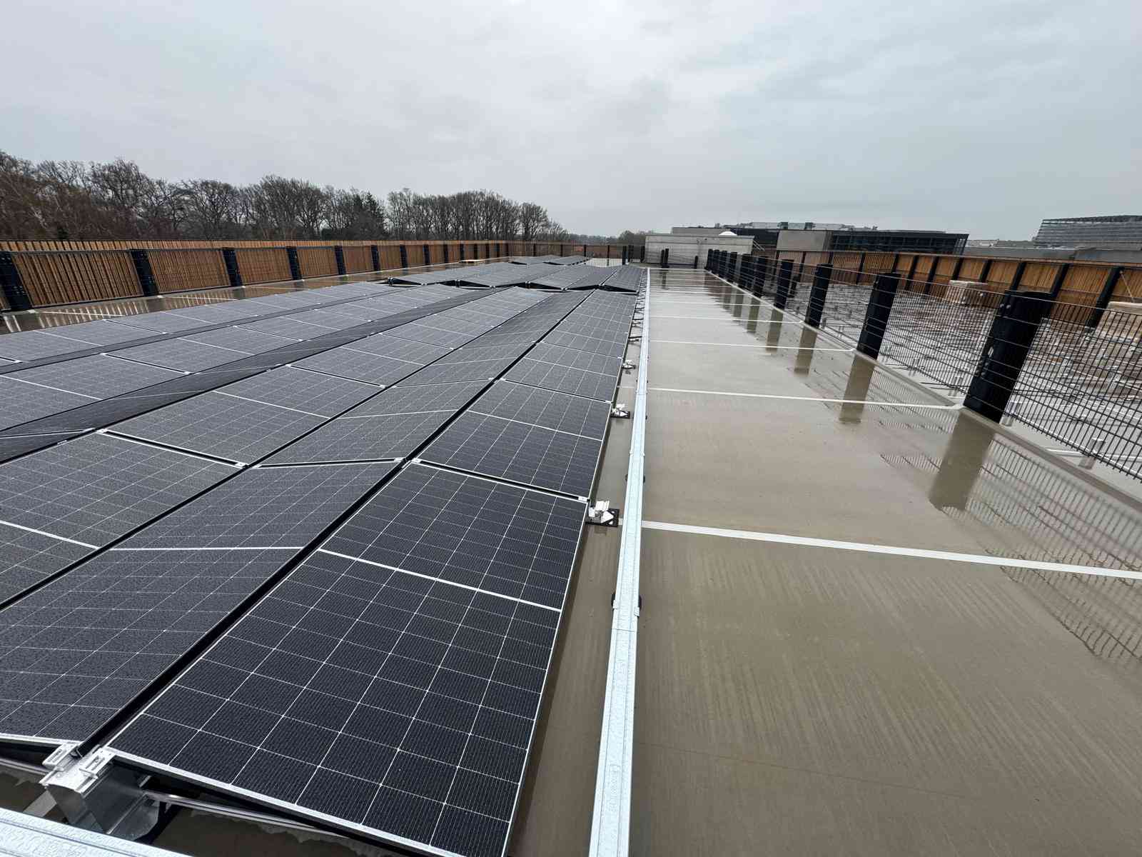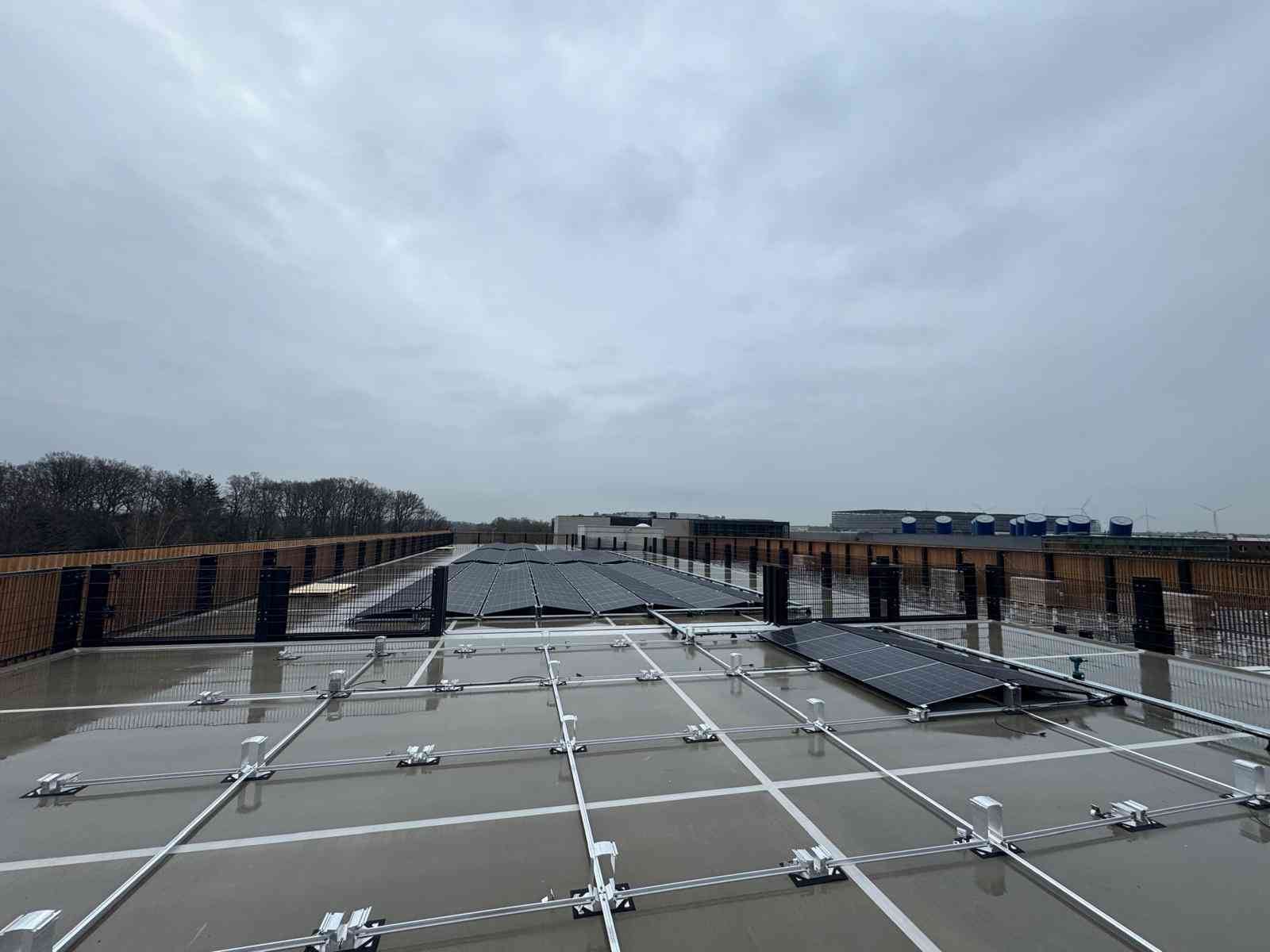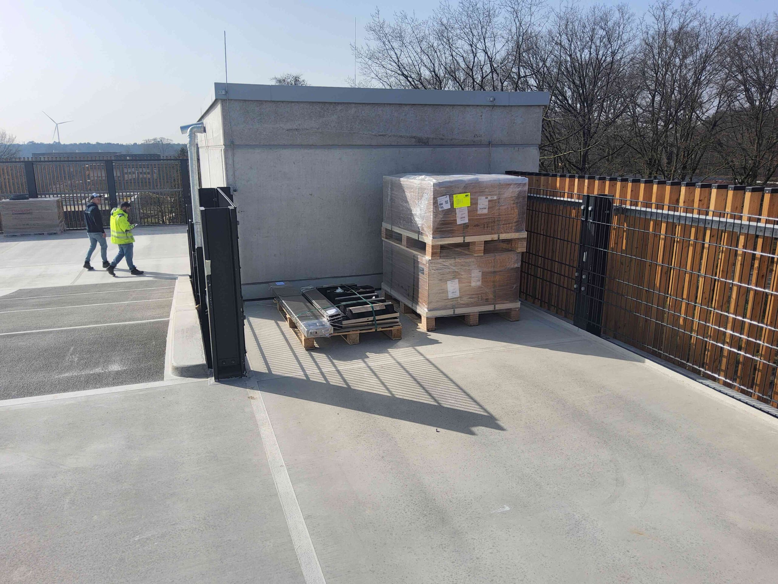 Auch die gesamte Ballastierung der Unterkonstruktion, die DC-Kabelwege vom Hersteller Conduct sowie die DC-Stringleitungen wurden auf das Parkdeck transportiert.
