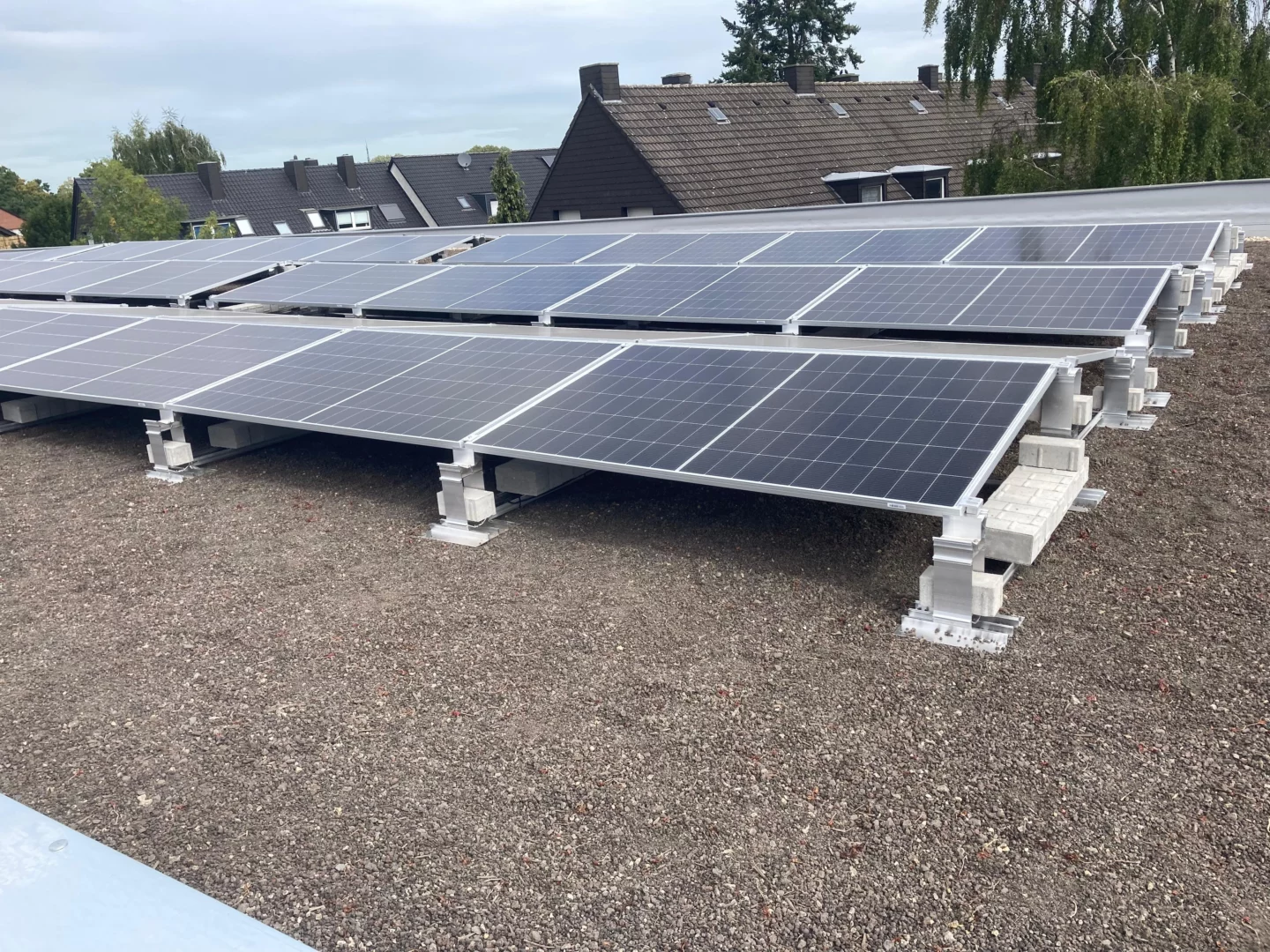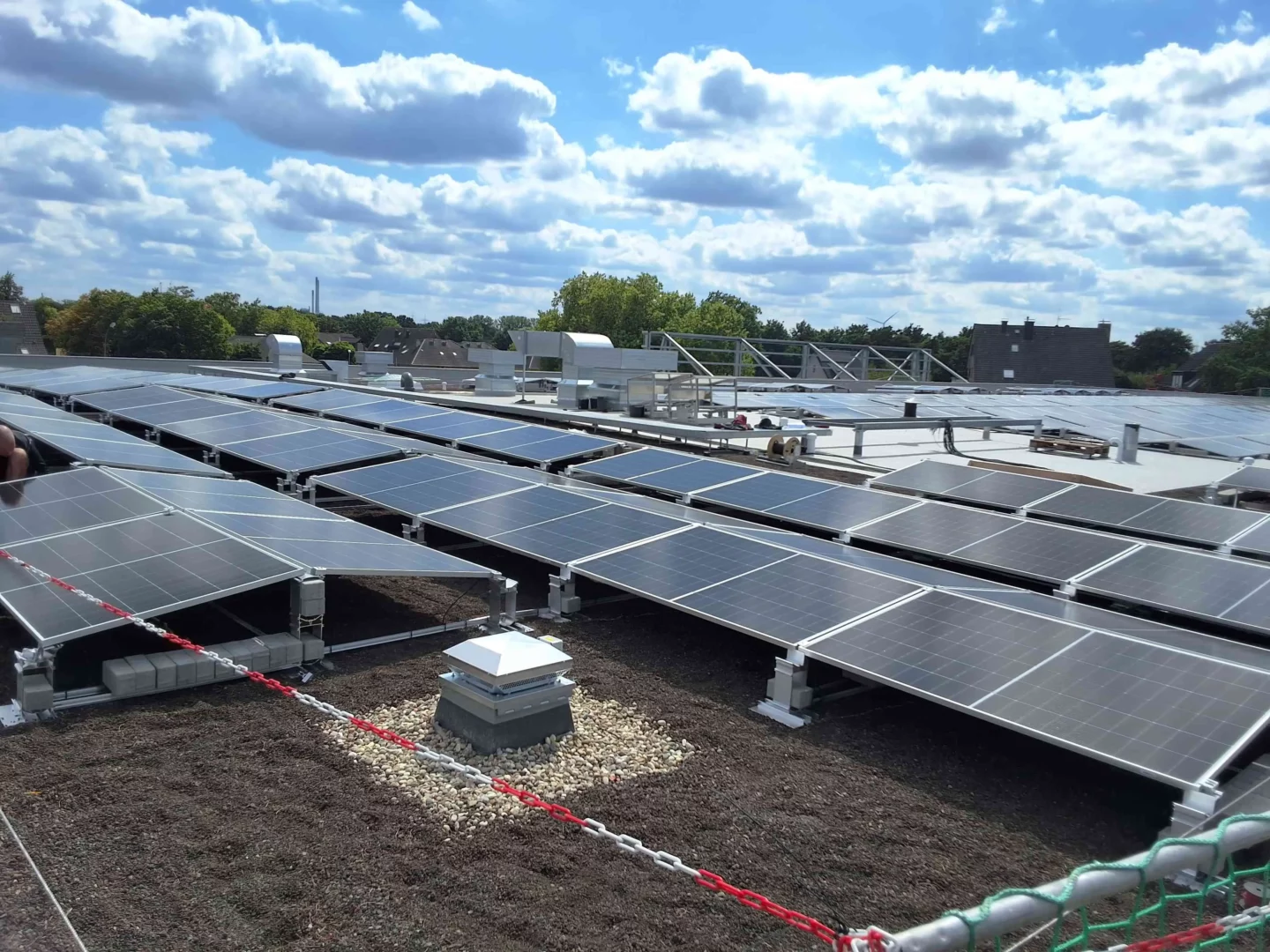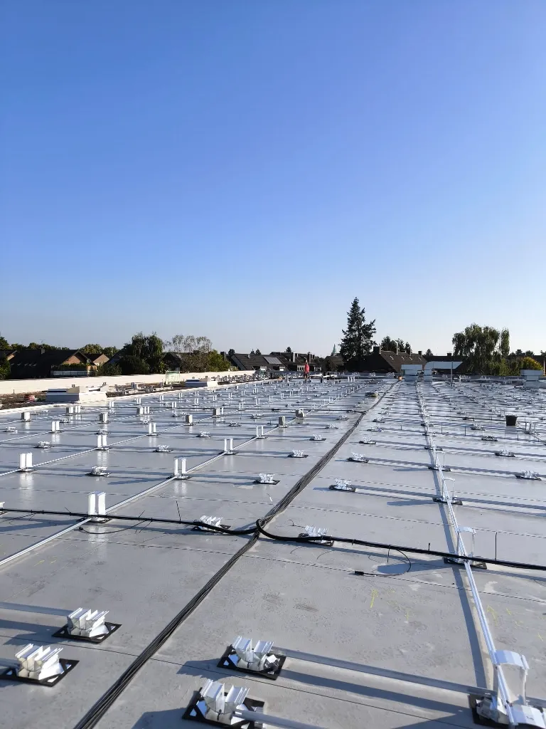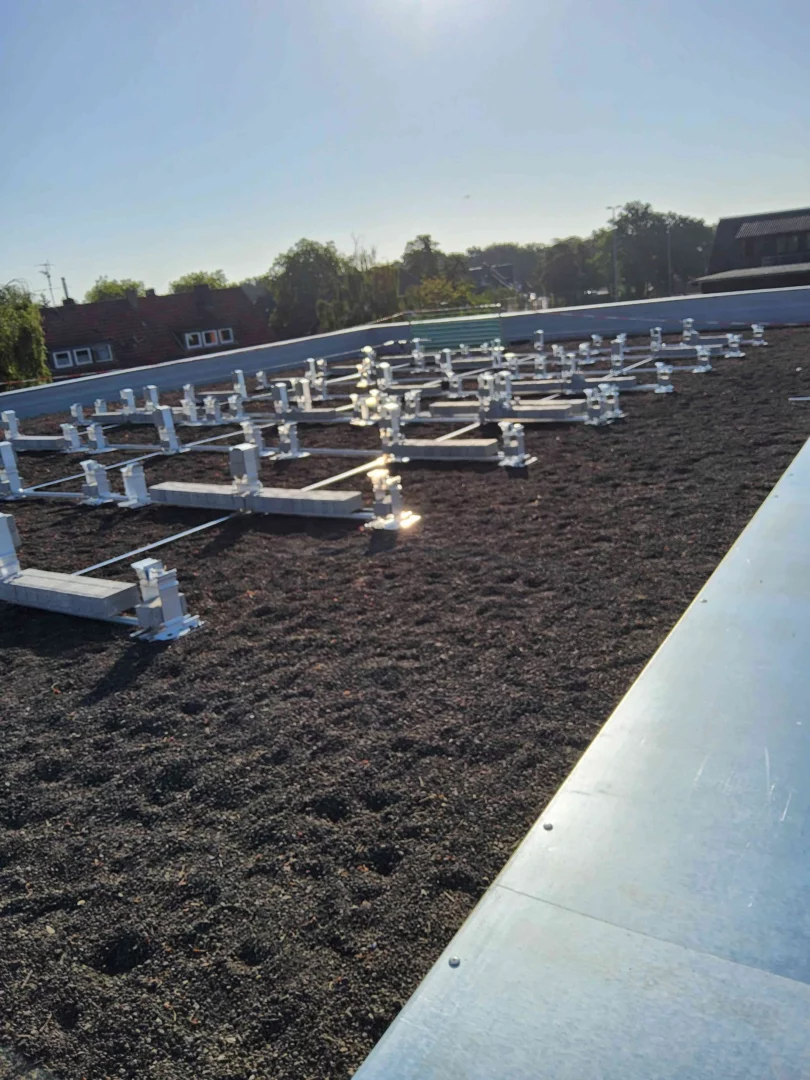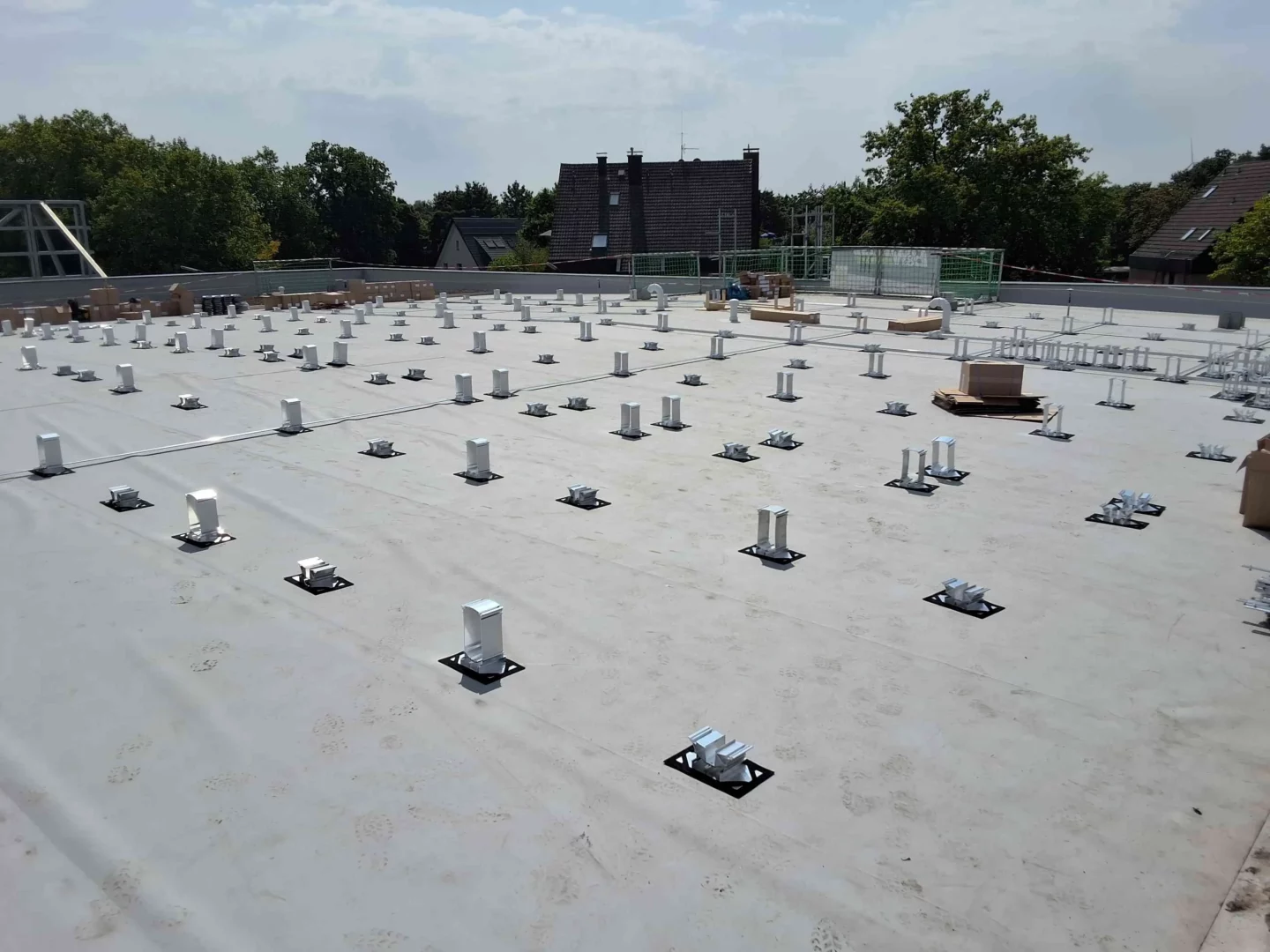 Auf den Dächern des Neubaus entsteht eine moderne Photovoltaikanlage, die ganz ohne Dachdurchdringung auskommt. Die Module sind in Ost-West-Ausrichtung montiert und so optimal zur Sonneneinstrahlung positioniert. Je nach Gebäudeteil gibt es unterschiedliche Lösungen: Auf den südöstlichen und nordwestlichen Flächen kommt ein Flachdachsystem für Folien-, Schweißbahnen- und Kiesdächer zum Einsatz, während im Westen und Osten eine Gründachanlage integriert wird. So verbindet das Projekt Technik und Nachhaltigkeit auf besondere Weise.