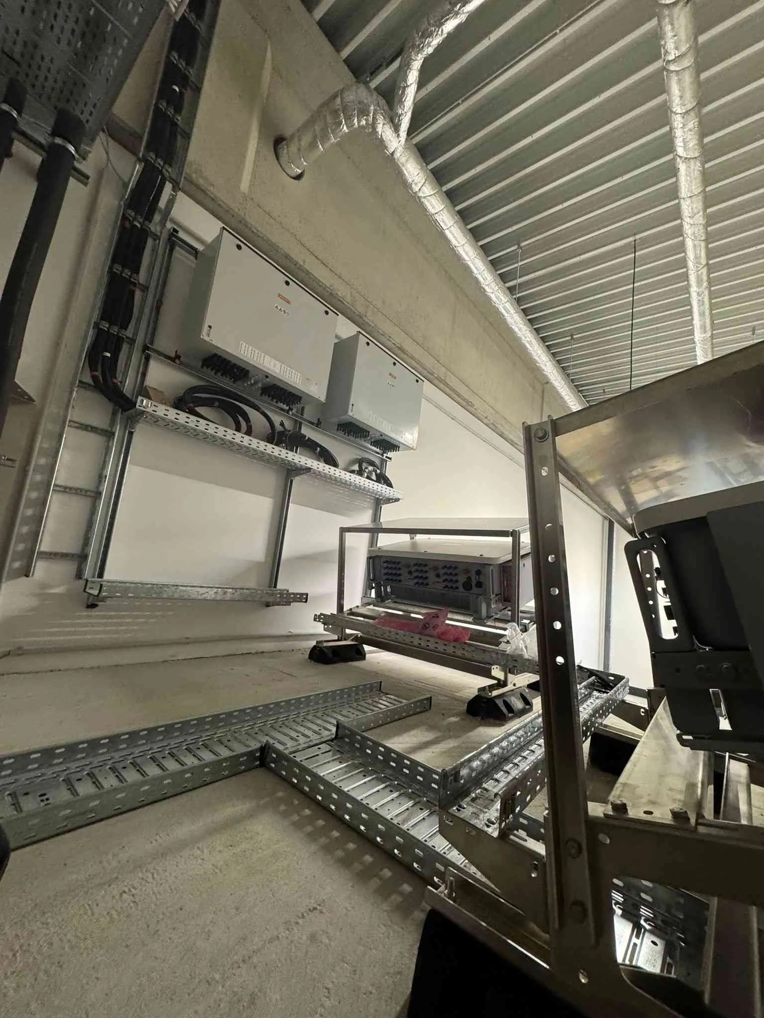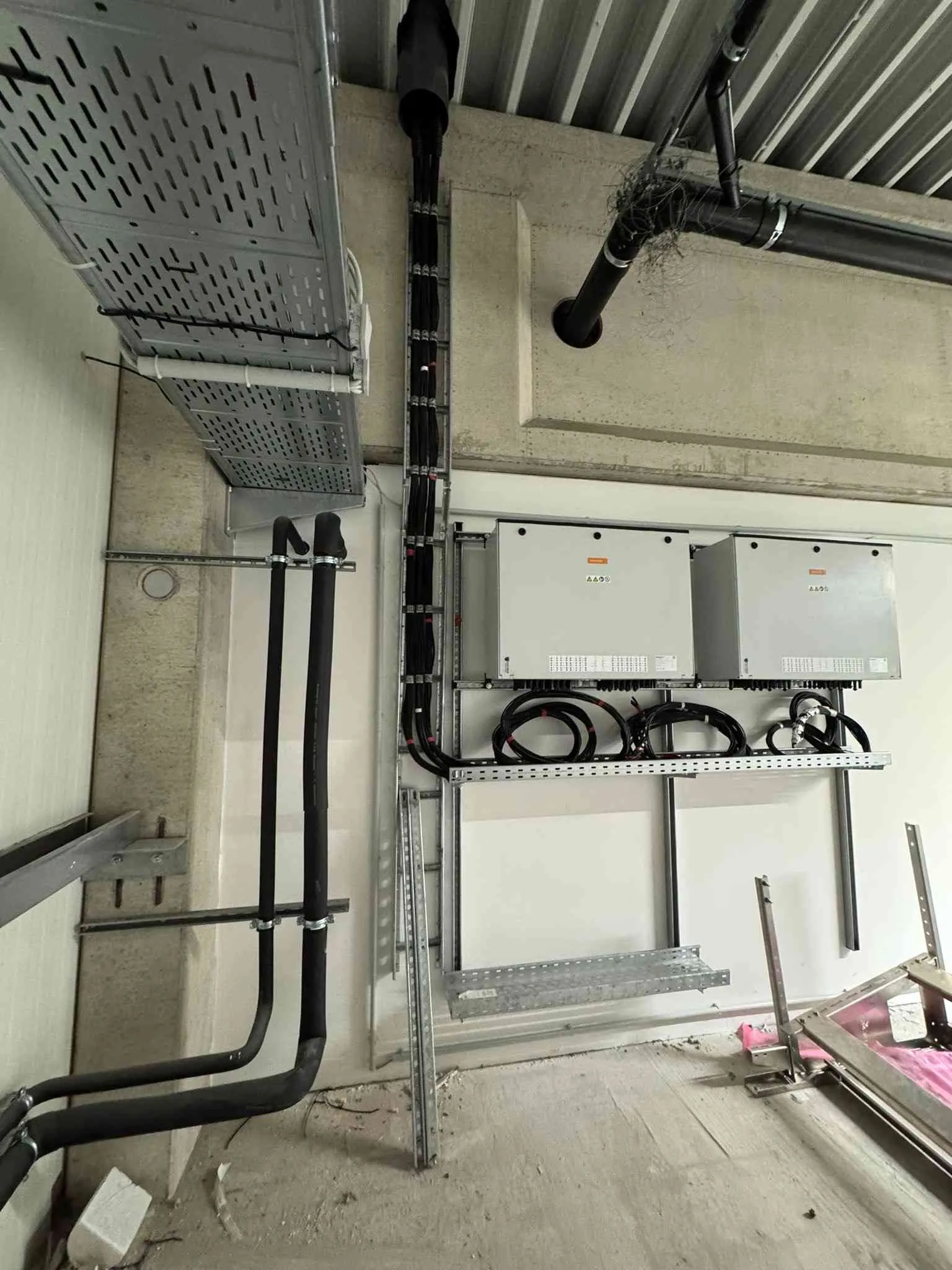 Auf der Baustelle des neuen EDEKA Honsel hat sich im Technikbereich erneut einiges bewegt. Die Wechselrichter wurden vom Dach ins Gebäude verlegt und befinden sich nun an einem geschützten und deutlich besser zugänglichen Standort – ideal für die kommenden Anschlussarbeiten und den späteren Betrieb.
